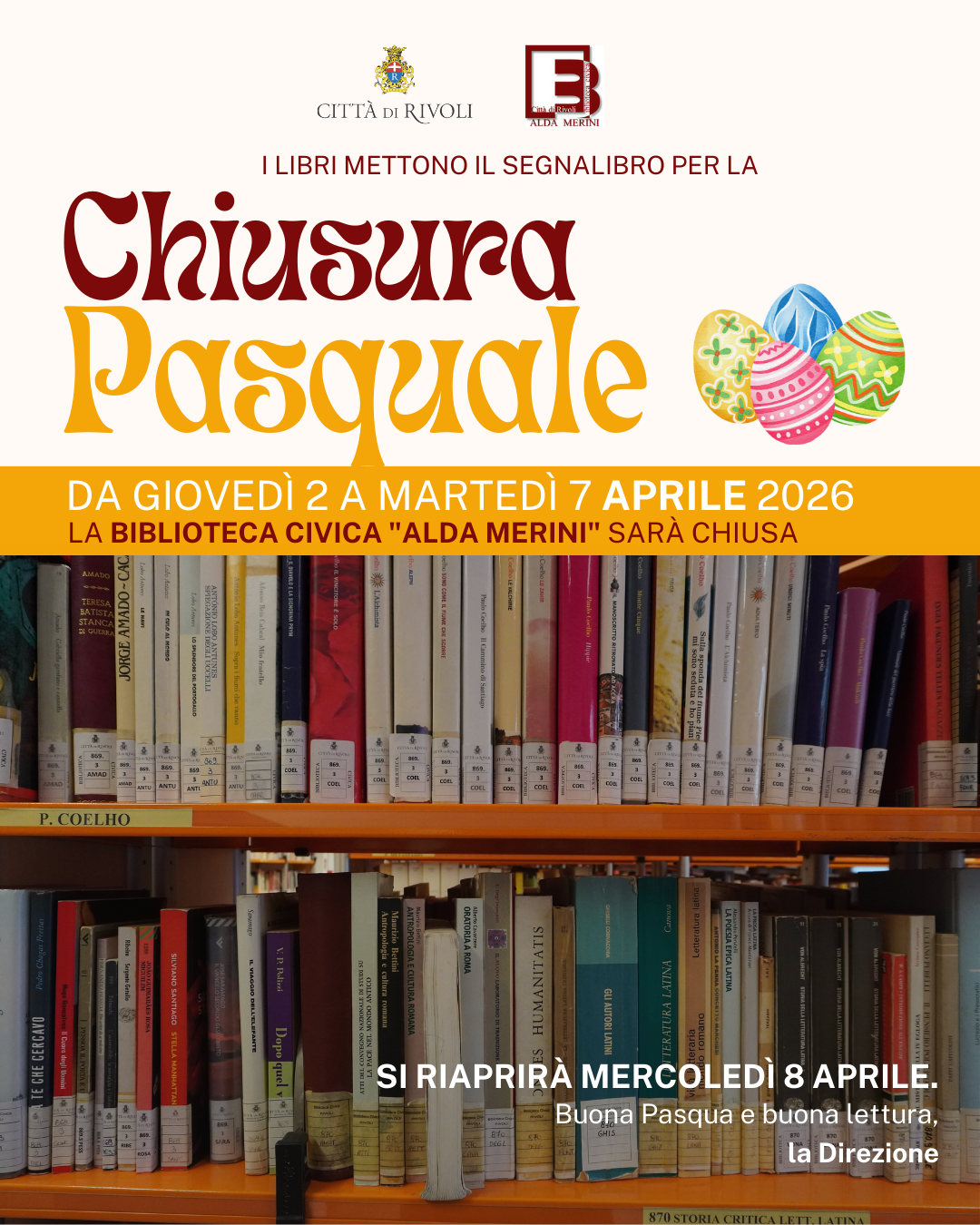 Descrizione La Biblioteca Civica Alda Merini rimarrà chiusa per le festività pasquali da giovedì 2 a martedì 7 aprile 2026 compreso. Si riaprirà mercoledì 8 aprile.