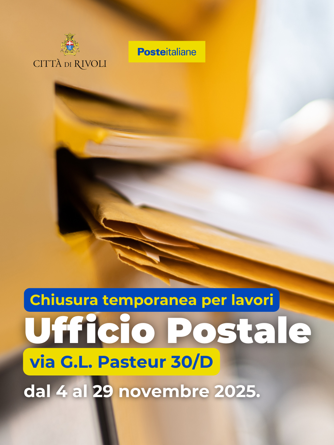 Per consentire la realizzazione di lavori infrastrutturali, l’Ufficio Postale di Rivoli, sito in via G.L. Pasteur 30/D, resterà chiuso al pubblico dal 4 al 29 novembre 2025.