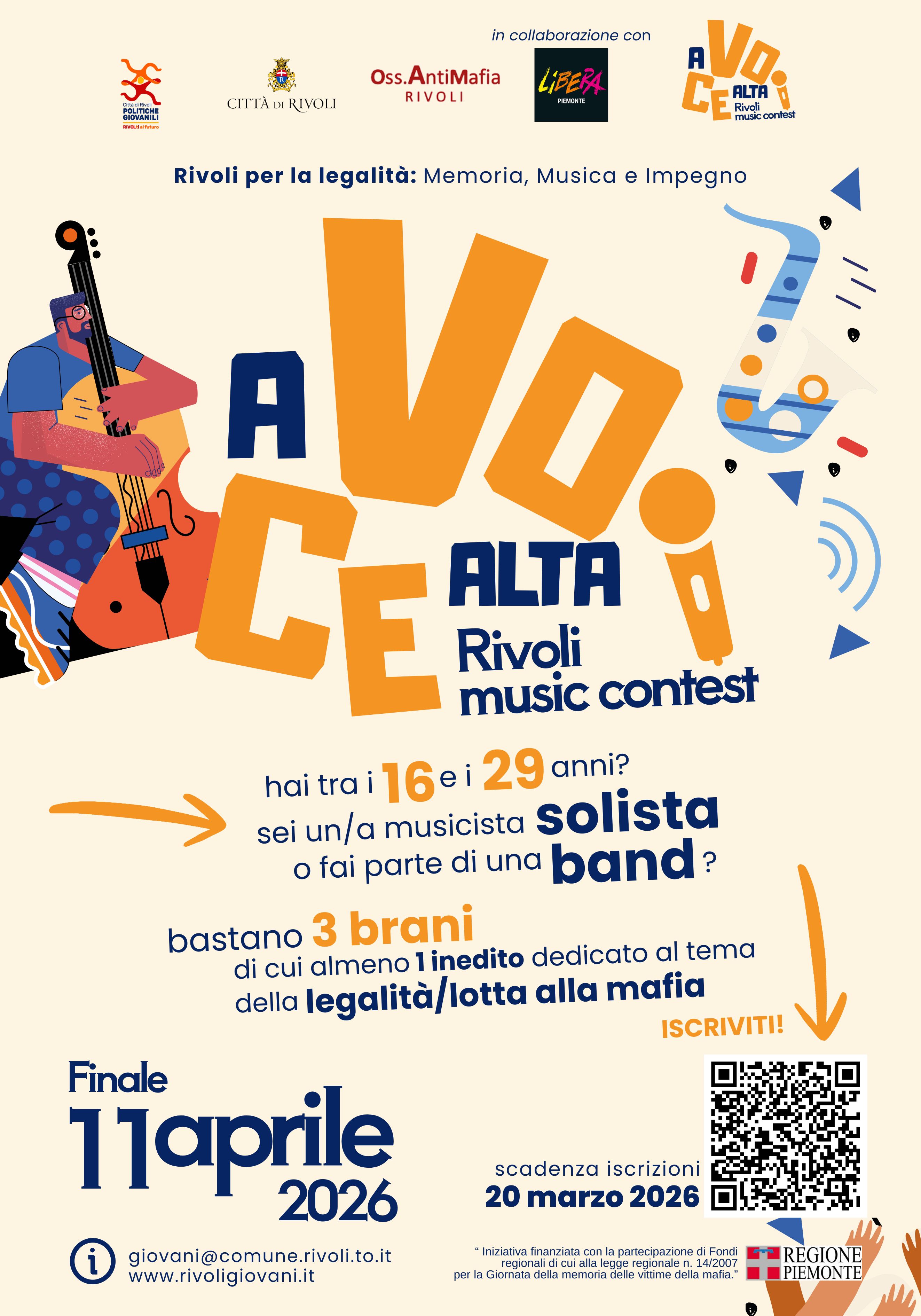 La Città di Rivoli, in collaborazione con Rivoligiovani, indice la prima edizione di “A Voce ALTA” – Rivoli Music Contest, iniziativa rivolta a solisti e band giovani residenti o domiciliati in Piemonte. Il contest intende valorizzare la musica quale strumento di espressione artistica, memoria e promozione della cultura della legalità.