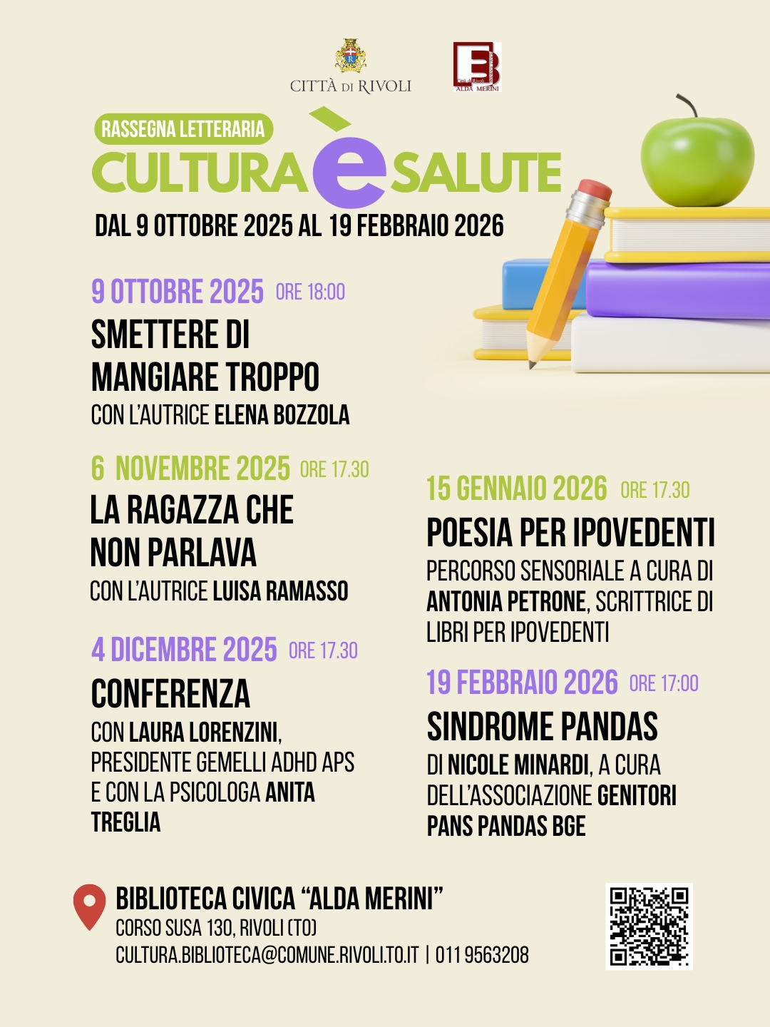 Prenderà il via giovedì 9 ottobre 2025 la rassegna letteraria “Cultura è Salute”, in programma fino al 19 febbraio 2026 presso la Biblioteca Civica “Alda Merini” di Corso Susa 130 a Rivoli.