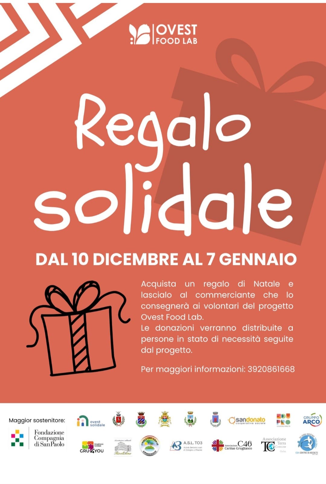 Dal 10 dicembre 2025 al 7 gennaio 2026, sarà attiva l’iniziativa “Regalo solidale”, promossa da Ovest FoodLab in collaborazione con le attività commerciali aderenti. L’iniziativa prevede la possibilità per i cittadini di acquistare un dono natalizio e lasciarlo direttamente al commerciante, che provvederà a consegnarlo ai volontari del progetto.
