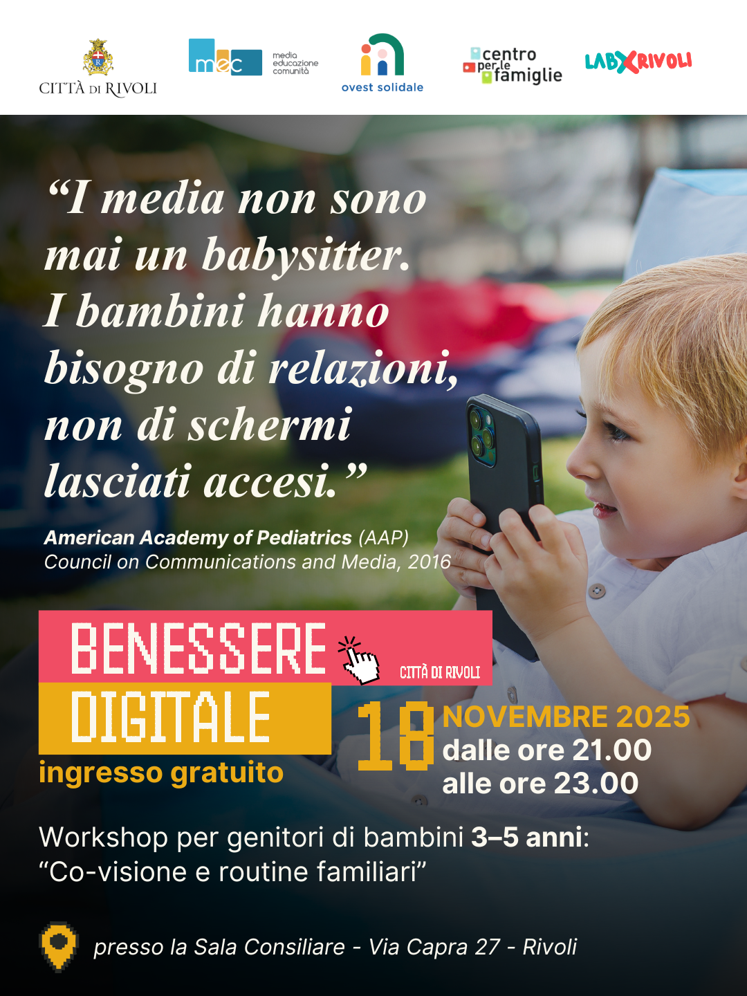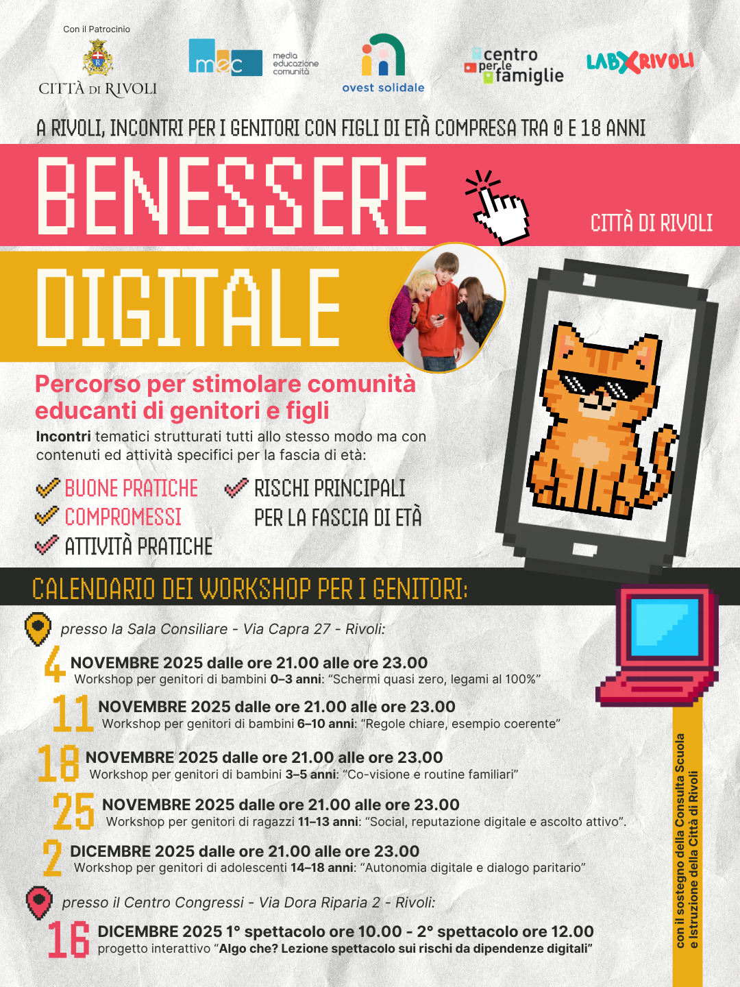 La Città di Rivoli, in collaborazione con Consorzio Ovest Solidale, Centro per le Famiglie - COS Rivoli Rosta Villarbasse Collegno Grugliasco e l'Associazione Mec e LabxRivoli, avvia il percorso "Benessere digitale", un'iniziativa finalizzata alla promozione di comunità educanti attraverso incontri formativi rivolti ai genitori con figli di età compresa tra 0 e 18 anni. Il progetto, che si svolge con il sostegno della Consulta Scuola e Istruzione della Città di Rivoli, si articola in workshop tematici strutturati per fasce d'età specifiche, affrontando buone pratiche, rischi principali e compromessi educativi attraverso attività pratiche mirate.