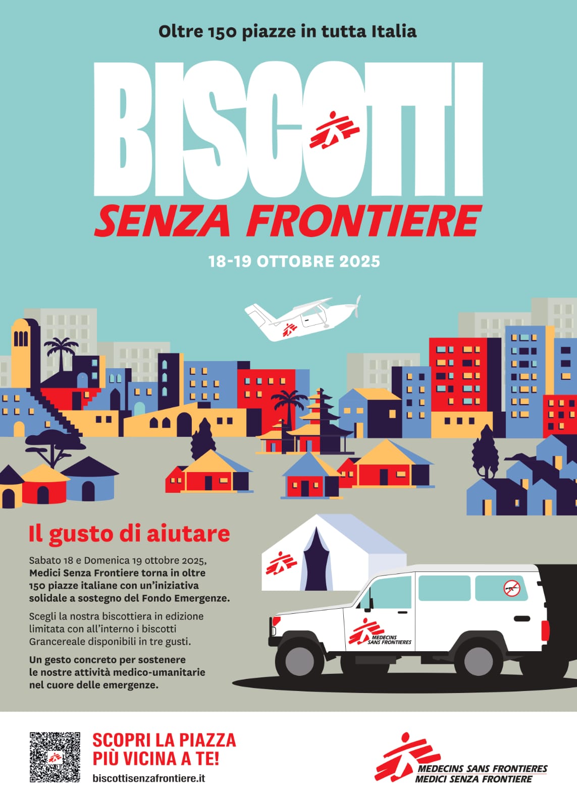 Sabato 18 e domenica 19 ottobre, Medici Senza Frontiere (MSF) sarà presente in piazza Martiri a Rivoli con la seconda edizione di “Biscotti Senza Frontiere”, evento che coinvolge oltre 150 piazze italiane e mira a sostenere il Fondo Emergenze dell’organizzazione. Il Fondo consente di garantire interventi medico-umanitari tempestivi e indipendenti in contesti di crisi, come guerre e calamità naturali.