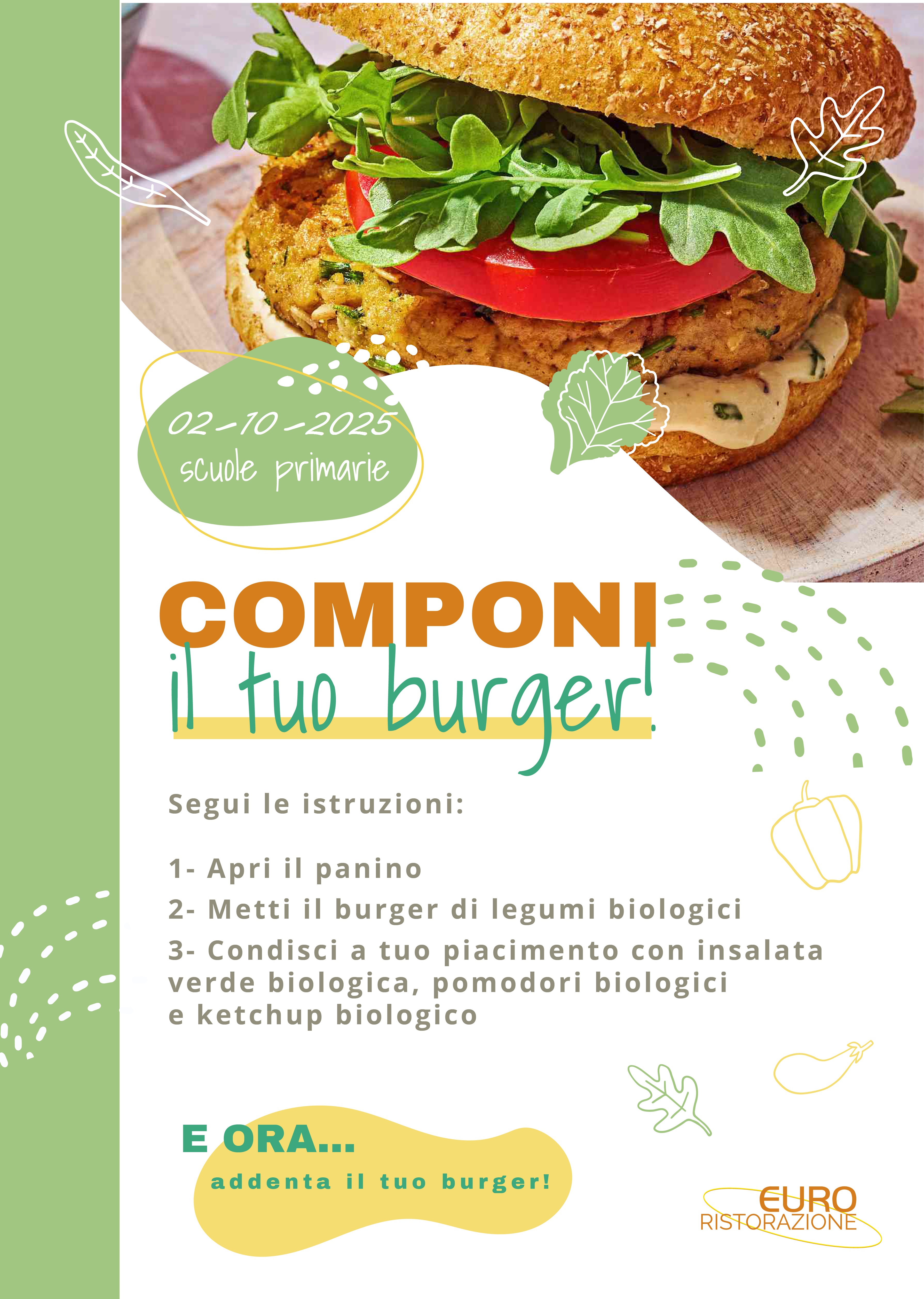 In linea con le indicazioni regionali per una sana e sostenibile alimentazione nelle scuole, giovedì 2 ottobre 2025 sarà servito un menù speciale dal titolo "Componi il tuo burger!", pensato per incentivare il consumo di legumi tra i più piccoli.