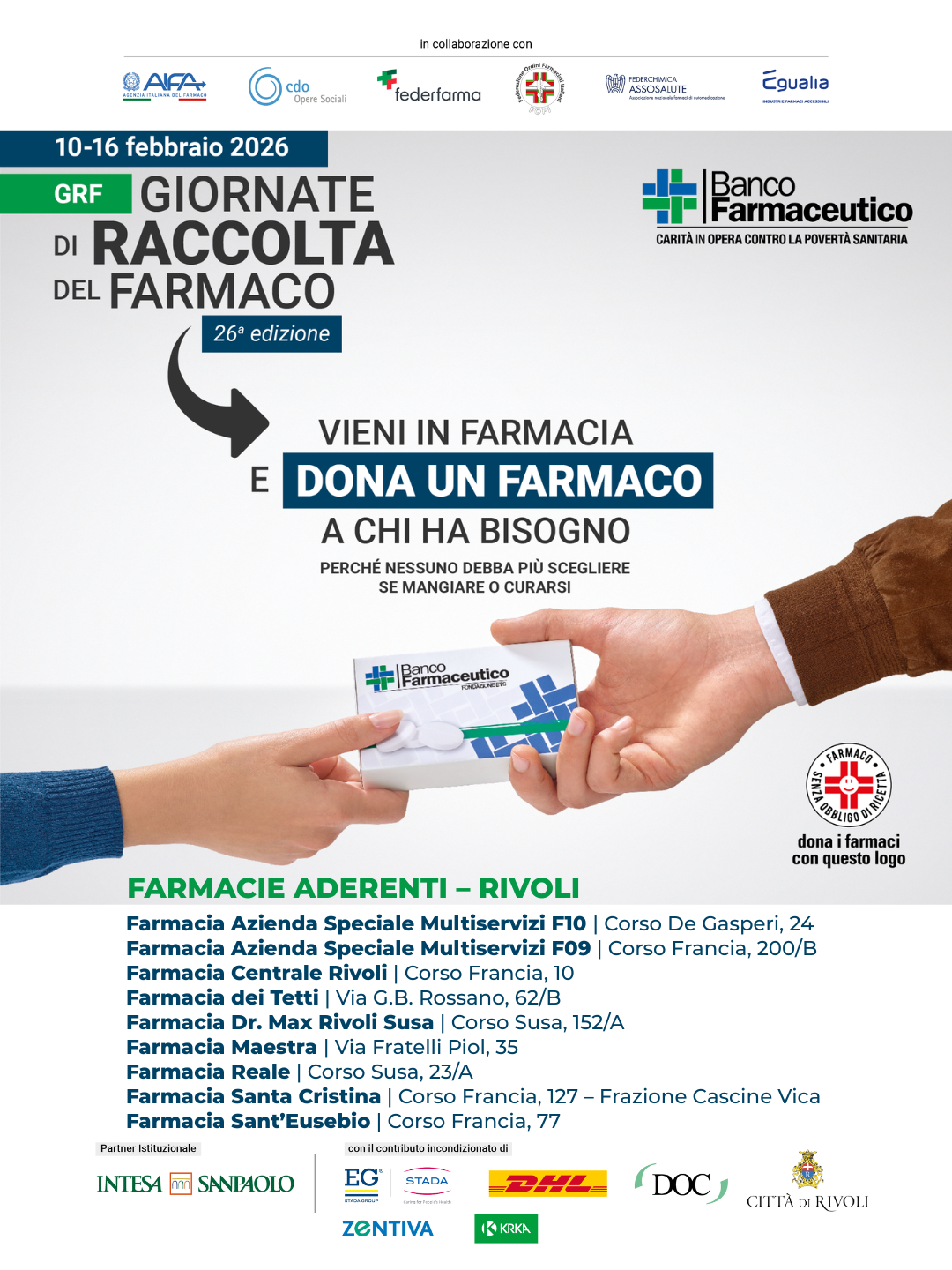 Dal 10 al 16 febbraio 2026 tornano anche a Rivoli le Giornate di Raccolta del Farmaco, iniziativa nazionale promossa dalla Fondazione Banco Farmaceutico, che coinvolge cittadini, farmacisti e volontari nella donazione di farmaci da banco destinati alle persone in condizione di povertà sanitaria. L’iniziativa rappresenta un’importante azione di solidarietà e di sostegno al diritto alla salute, favorendo l’accesso alle cure per le fasce più fragili della popolazione.