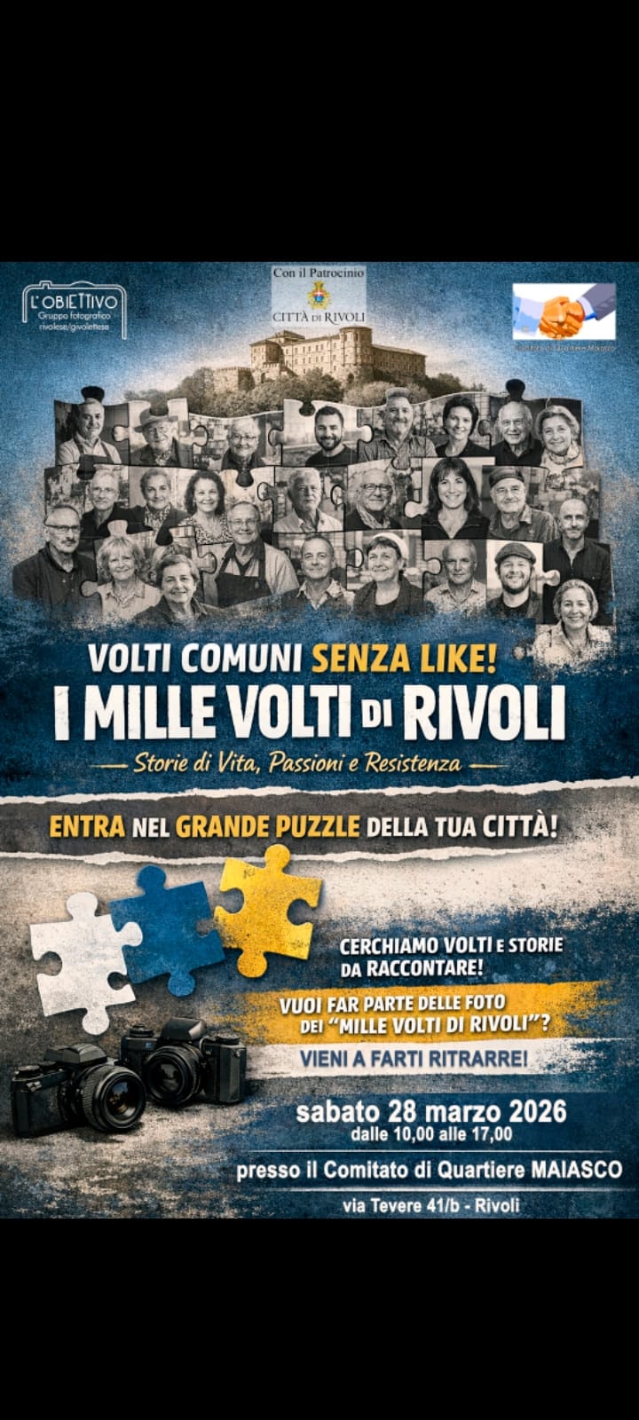 Il Comitato di Quartiere Maiasco in collaborazione con il gruppo fotografico "L'Obiettivo" e con il Patrocinio del Comune di Rivoli, promuove l'iniziativa denominata "I Mille Volti di Rivoli". Il progetto si configura come un'attività di documentazione storica e sociale volta a celebrare l'identità del territorio attraverso i ritratti dei suoi abitanti. L'obiettivo dell'intervento culturale è la creazione di un mosaico collettivo che metta al centro le storie e i legami autentici della cittadinanza, offrendo una testimonianza tangibile della realtà locale.