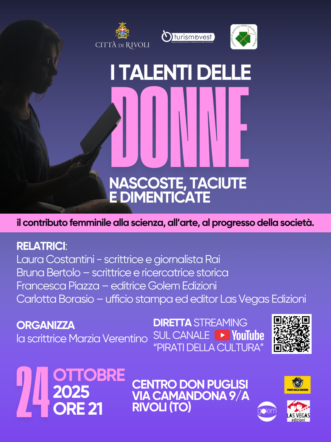 Venerdì 24 ottobre 2025, alle ore 21, presso il Centro Don Puglisi in Via Camandona 9/A a Rivoli, si terrà l’incontro pubblico “I talenti delle donne: nascoste, taciute e dimenticate”. L’iniziativa, organizzata dalla scrittrice Marzia Verentino, sarà dedicata al tema del contributo femminile alla scienza, all’arte e al progresso della società.