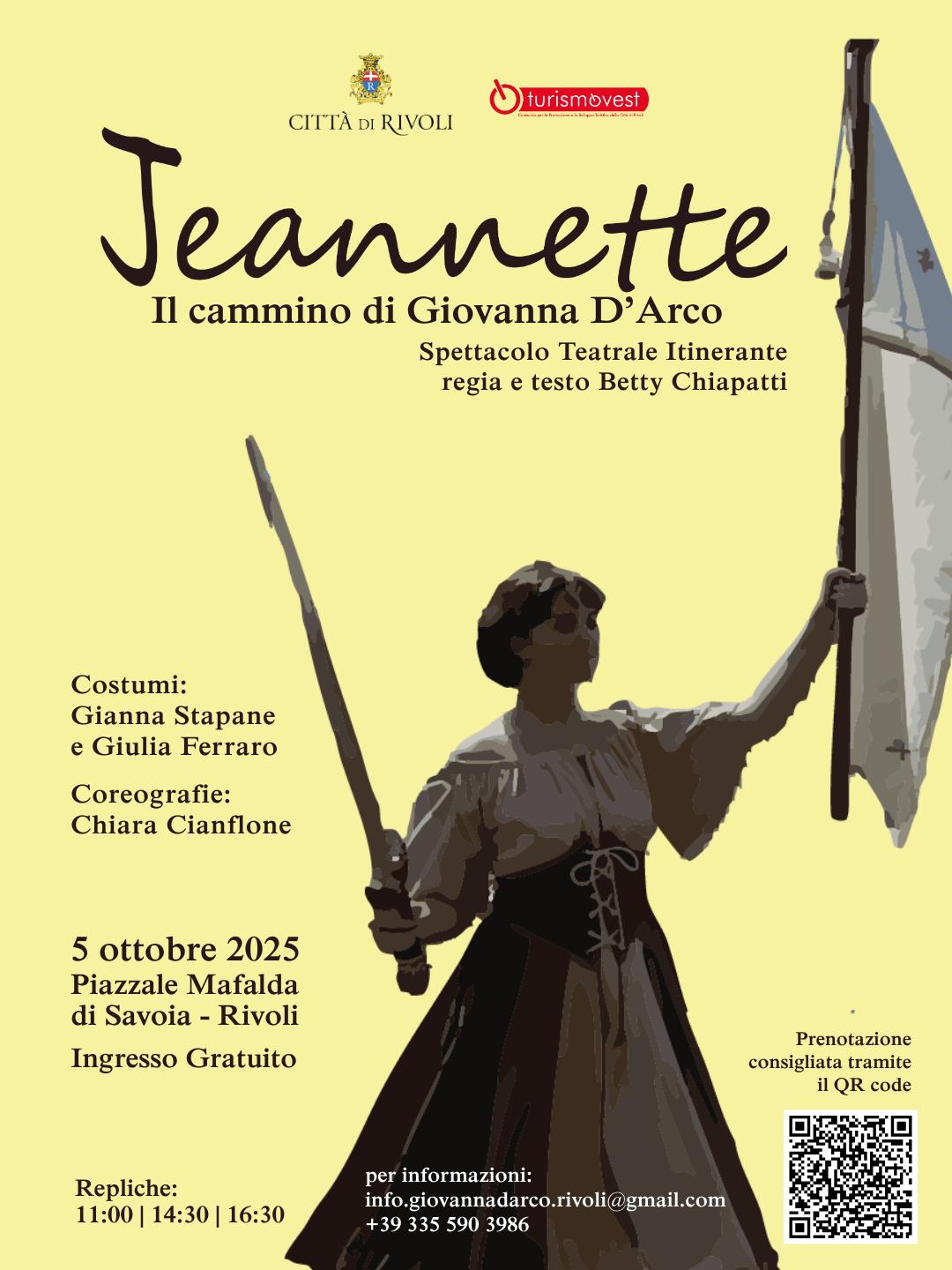 Domenica 5 ottobre 2025, presso il Piazzale Mafalda di Savoia, si terrà lo spettacolo teatrale itinerante “Jeanette. Il cammino di Giovanna D’Arco”, con testo e regia di Betty Chiapatti.