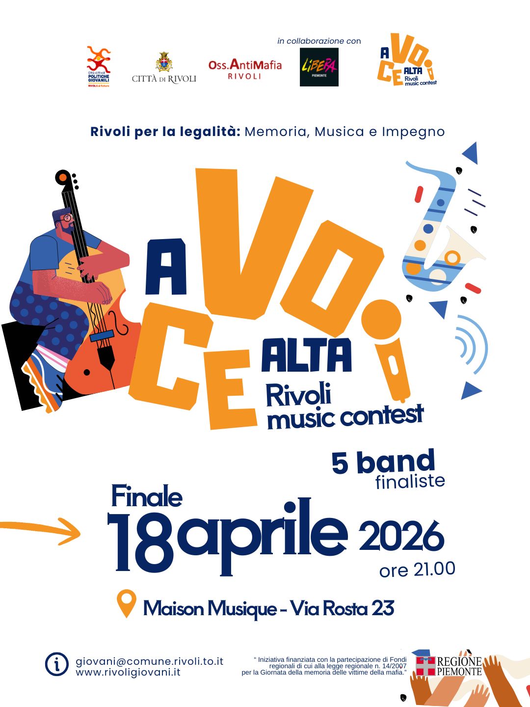 Sabato 18 aprile 2026 alla Maison Musique in via Rosta 23, finale del concorso“A Voce ALTA” – Rivoli Music Contest, iniziativa rivolta a solisti e band giovani residenti o domiciliati in Piemonte. Contest che intende valorizzare la musica quale strumento di espressione artistica, memoria e promozione della cultura della legalità. A cura della Città di Rivoli, in collaborazione con Rivoligiovani.