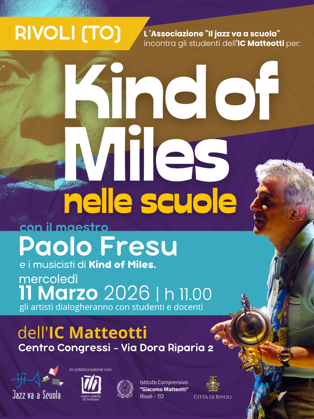 L’11 marzo 2026, dalle ore 11.00 alle ore 13.00, presso il Centro Congressi di via Dora Riparia n. 2, gli studenti dell’Istituto Comprensivo Giacomo Matteotti di Rivoli con il supporto del Dirigente Scolastico Pierangelo Limuti e docente organizzatrice Rita Tornincasa nonché socia Jvasparteciperanno al dialogo musicale “Kind of Miles” con il trombettista Paolo Fresu e la sua band. L’iniziativa è curata dall’Associazione “Il jazz va a scuola”.