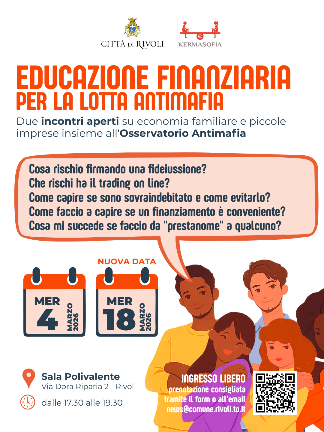 La Città di Rivoli e l'Osservatorio Antimafia in collaborazione con l’ente Kermasofia, organizza due incontri informativi dedicati ai temi dell’economia familiare e della gestione delle piccole imprese, con l’obiettivo di rafforzare le competenze economico-finanziarie dei cittadini. Primo appuntamento mercoledì 4 marzo, dalle ore 17.30 alle 19.30, presso la Sala Polivalente di Rivoli, in via Dora Riparia 2.