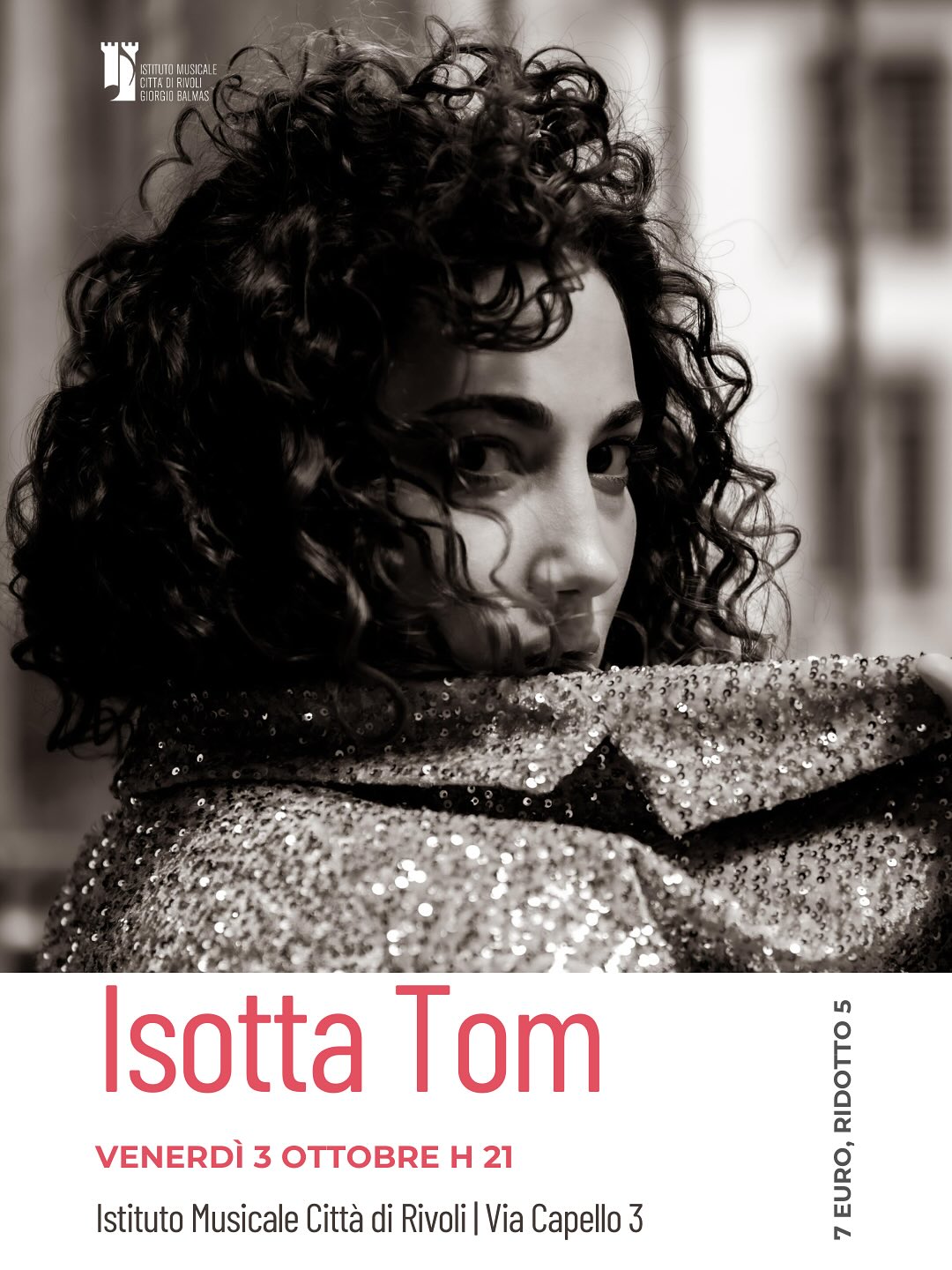 Venerdì 3 Ottobre alle 21:00 arriva all’Istituto di Via Capello la musica suadente e intima, ironica e fresca della cantautrice Isotta Tom: anima rock che si muove tra indie pop e contaminazioni soul, porta i suoi ultimi successi a pianoforte e voce, accompagnata alla chitarra da Giuseppe Rocca in un live unico e convolgente.