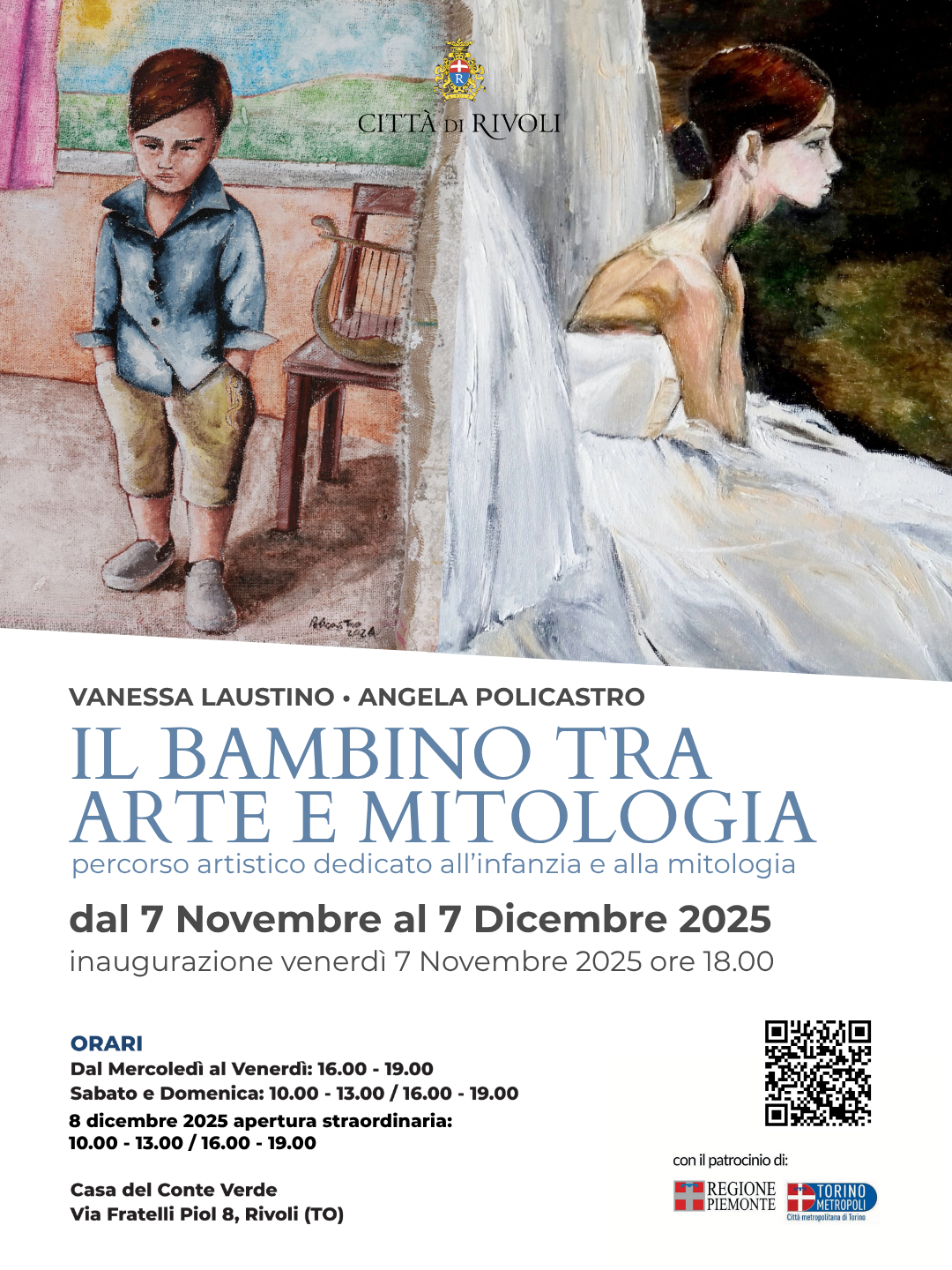Il Museo Civico Casa del Conte Verde di Rivoli è lieto di ospitare Il bambino tra arte e mitologia, la nuova mostra di pittura delle artiste Vanessa Laustino e Angela Policastro. L’esposizione, inserita nel programma dedicato alla Giornata Internazionale dei Diritti dell’Infanzia e dell’Adolescenza (20 novembre), propone un percorso visivo e poetico che indaga l’universo dell’infanzia attraverso le sue molteplici espressioni: il gioco e il sogno, l’incanto della danza, la meraviglia del viaggio come scoperta di sé e del mondo. In questo dialogo tra arte e mito, il curatore e critico Angelo Mistrangelo sottolinea come “Il rapporto che si instaura tra l’artista e la materia cromatica di un campo di papaveri, tra l’incisività del segno e la meditata definizione di Asterope Le Pleiadi, rappresenti un punto di accesso privilegiato alle poetiche immagini di Vanessa Laustino, che si intrecciano e si fondono con il racconto mitologico di Ares e Afrodite delineato da Angela Policastro.”