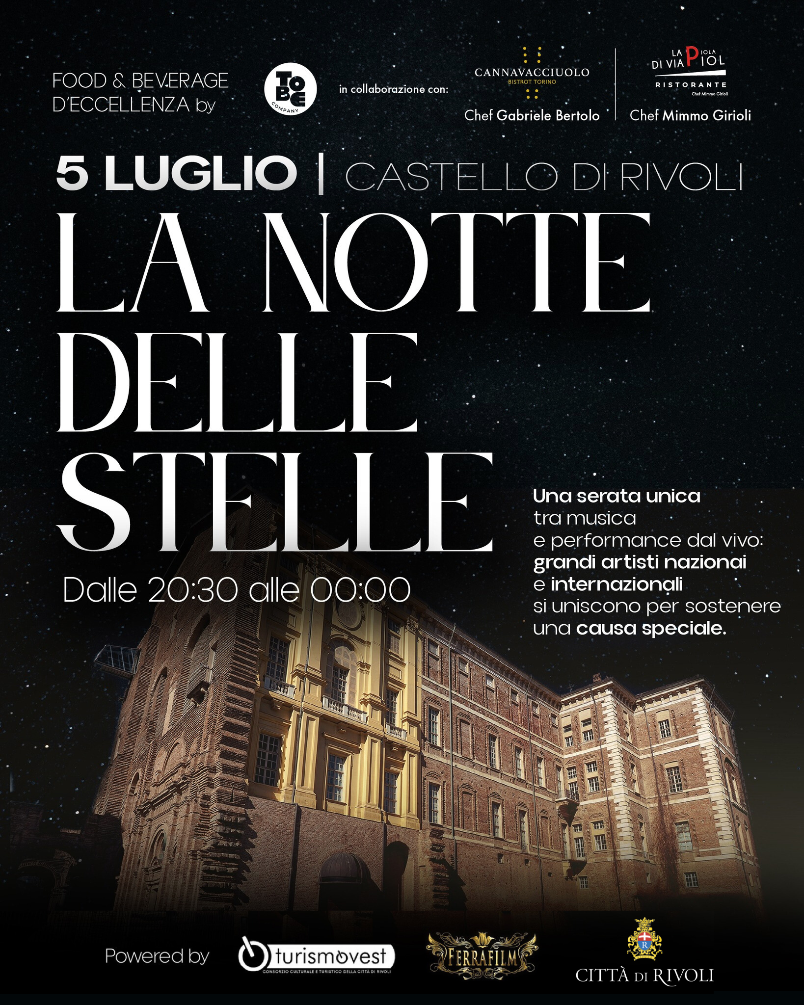 Durante la manifestazione sarà attiva un’area food curata da Bistrot Cannavacciuolo, con gli chef Gabriele Bertolo e Mimmo Girioli. Nella stessa giornata, il Castello di Rivoli Museo d’Arte Contemporanea estenderà l’orario di apertura fino alle 21:00 (ingresso a pagamento), offrendo un’opportunità in più per vivere una notte speciale tra arte e musica.