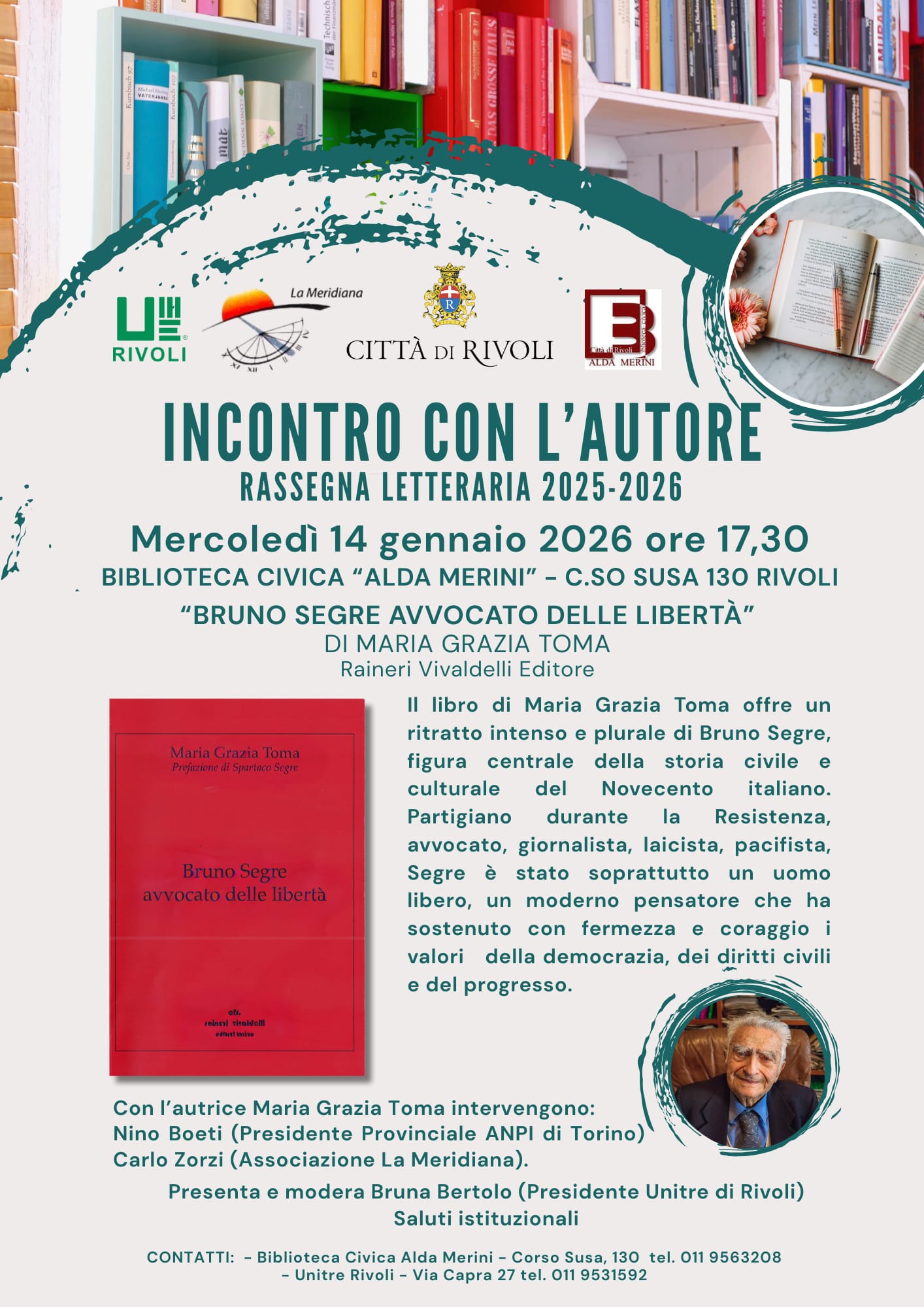 La Città di Rivoli è lieta di invitarvi alla presentazione del nuovo libro di Maria Grazia Toma, Bruno Segre. Avvocato delle libertà, in programma Mercoledì 14 gennaio 2026 alle ore 17.30, presso la Biblioteca Civica Alda Merini (in Corso Susa 30).