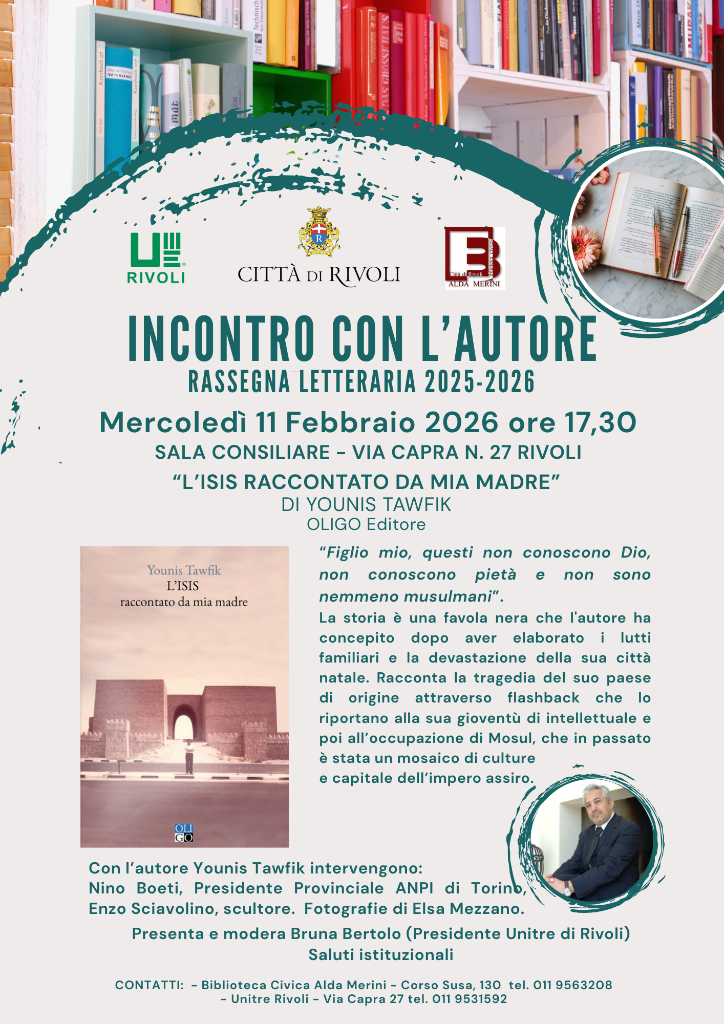 La Città di Rivoli è lieta di invitarvi alla presentazione del nuovo libro di Younis Tawfik, "L'ISIS raccontato da mia madre" (OLIGO Editore), in programma Mercoledì 11 febbraio 2026 alle ore 17.30, presso la Sala Consiliare di via Capra 27 a Rivoli.