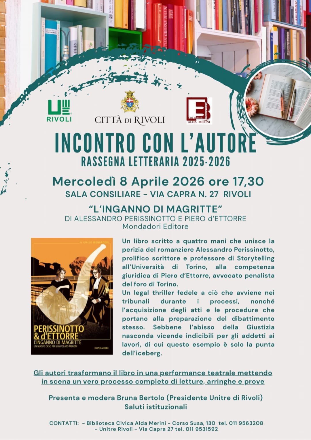 La Città di Rivoli invita la cittadinanza a un nuovo appuntamento culturale con la presentazione del romanzo “L’inganno di Magritte” (Mondadori), scritto a quattro mani da Alessandro Perissinotto e Piero d'Ettorre, in programma mercoledì 8 aprile 2026 alle ore 17.30 presso la Sala Consiliare di via Capra 27.