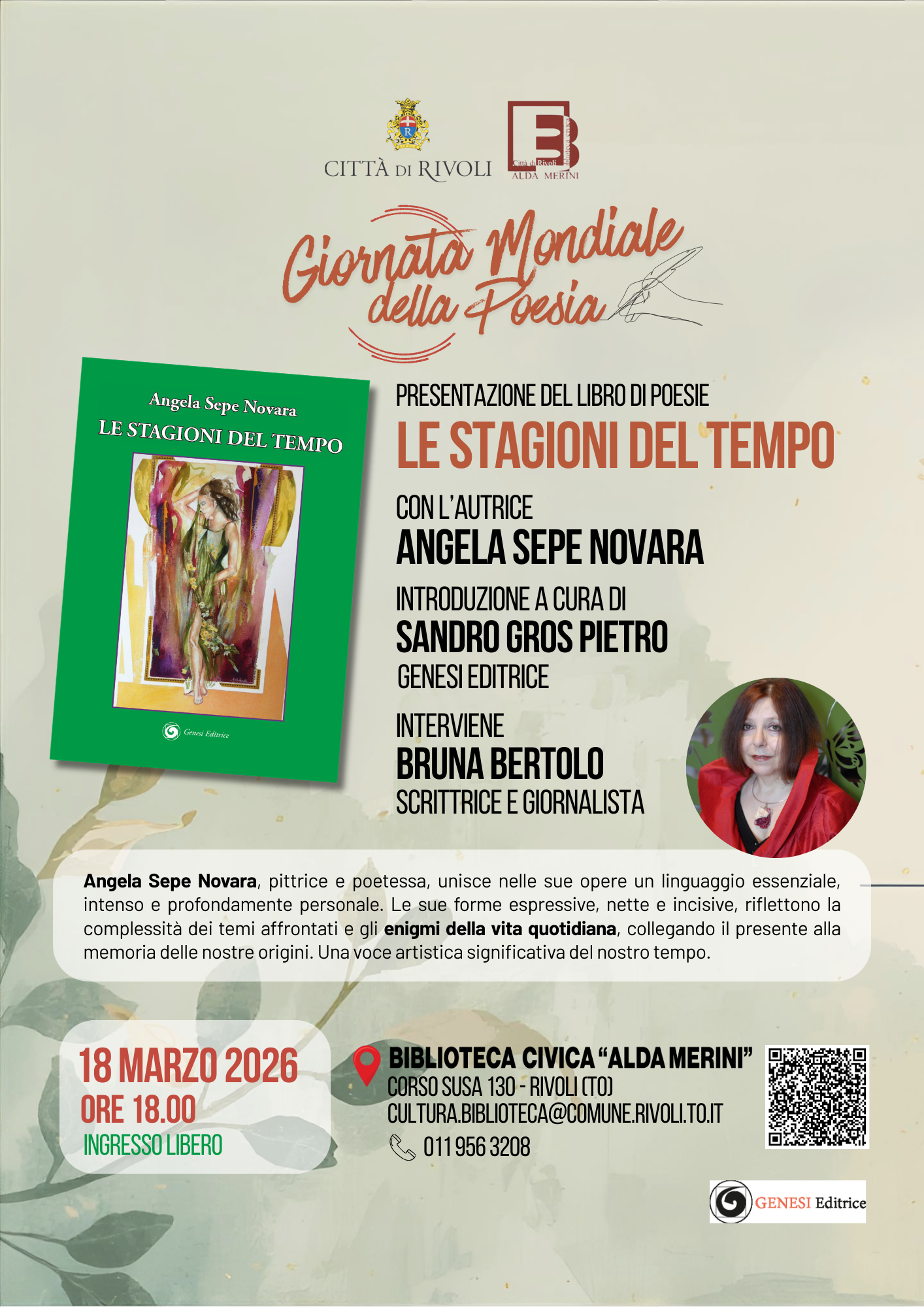 La Città di Rivoli è lieta di invitare cittadini e appassionati di poesia alla presentazione del nuovo libro di Angela Sepe Novara, Le stagioni del tempo, mercoledì 18 marzo 2026 alle ore 18.00, presso la Biblioteca Civica Alda Merini, in Corso Susa 130. L’incontro sarà introdotto da Sandro Pietro Gros, editore di Genesi Edizioni, e vedrà la partecipazione della scrittrice e giornalista Bruna Bertolo, che accompagnerà il pubblico alla scoperta di questa raccolta poetica.