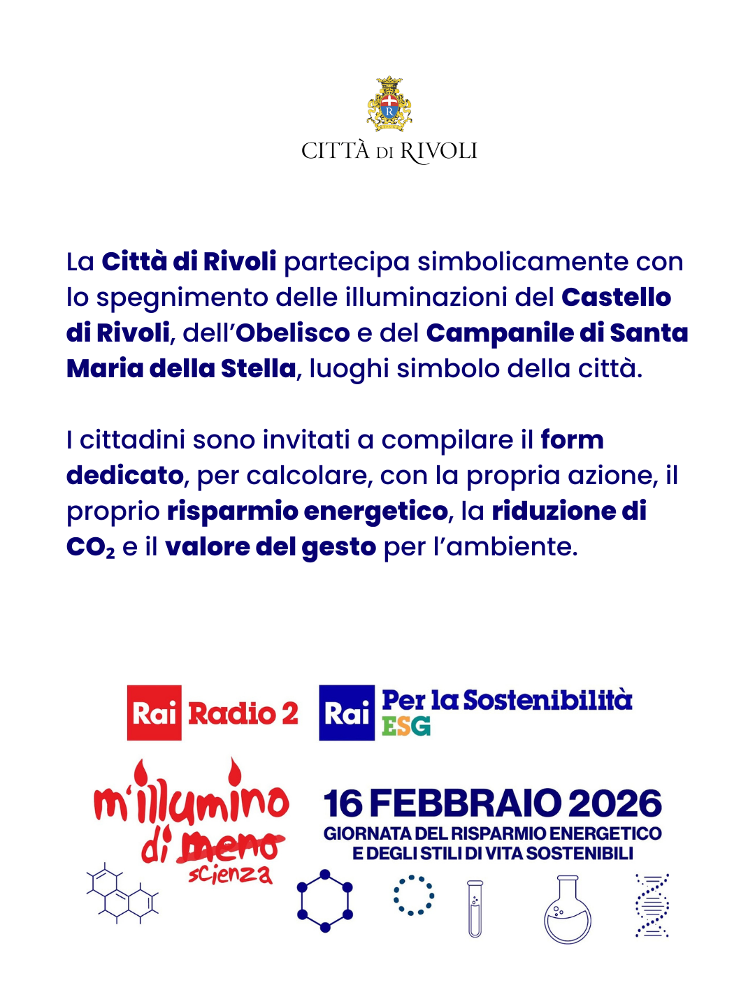 attraverso lo spegnimento delle illuminazioni del Castello di Rivoli, dell’Obelisco e del Campanile di Santa Maria della Stella, luoghi rappresentativi del patrimonio storico e identitario cittadino. Contestualmente, i cittadini saranno invitati a partecipare attivamente compilando un apposito form dedicato, che consentirà di quantificare e inviare il contributo individuale in termini di energia totale risparmiata, riduzione delle emissioni di CO₂ e relativa equivalenza simbolica, favorendo la diffusione di comportamenti consapevoli e il rafforzamento della cultura della sostenibilità ambientale.