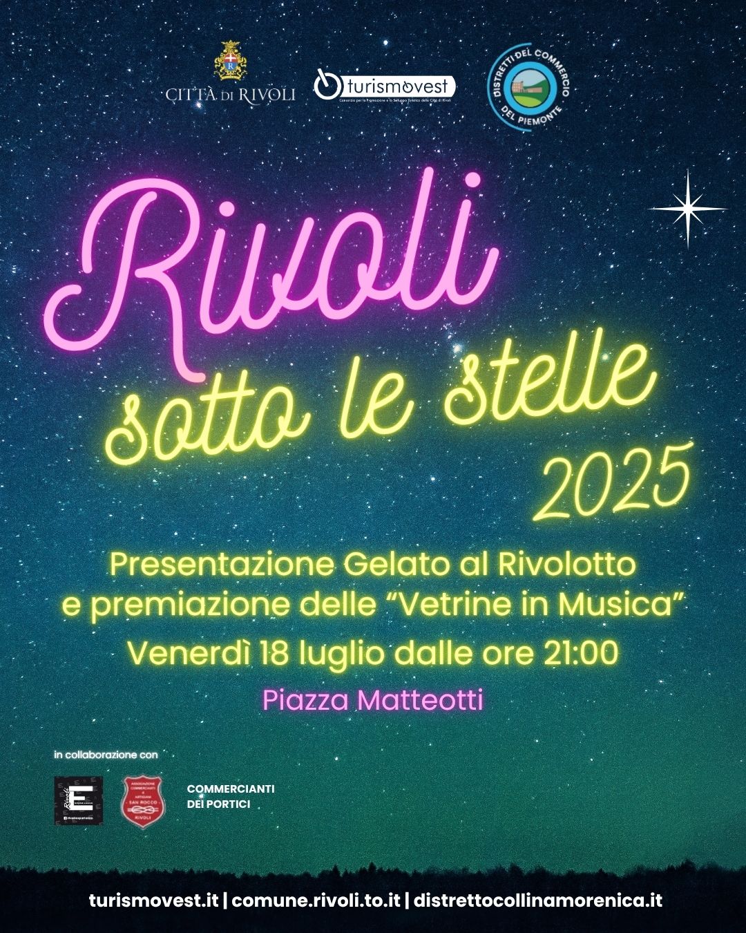 Un fine settimana all’insegna della dolcezza, della musica e della valorizzazione del commercio locale è alle porte. Venerdì 18 luglio, a partire dalle ore 21, Piazza Matteotti sarà il cuore pulsante di “Rivoli sotto le Stelle”, con due iniziative promosse dalla Città di Rivoli in collaborazione con TurismOvest e il Distretto Diffuso del Commercio della Collina Morenica.