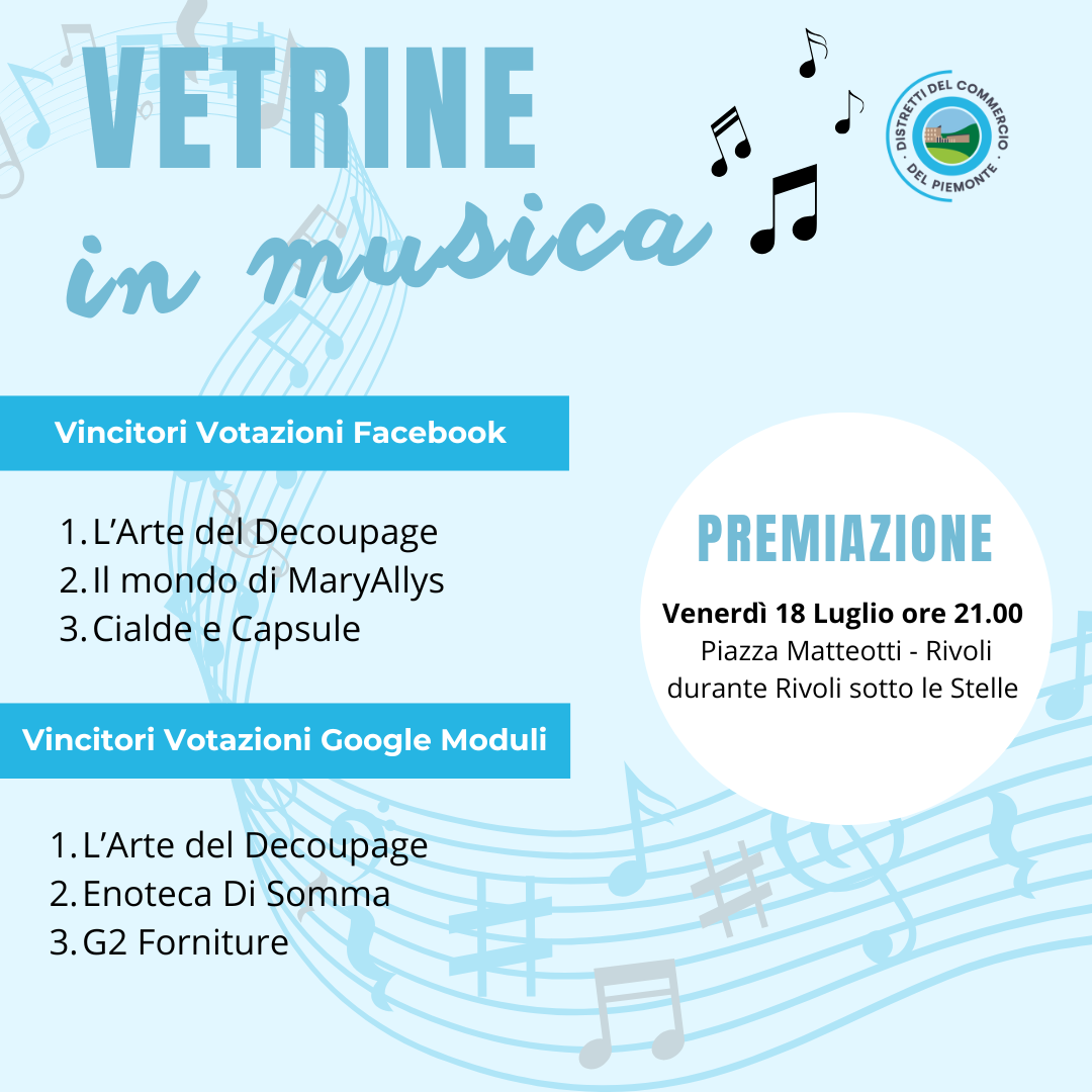 Nel corso della stessa serata verranno premiate le vetrine più originali e apprezzate del contest “Vetrine in Musica”, iniziativa lanciata dal Distretto del Commercio della Collina Morenica in occasione della Festa della Musica.